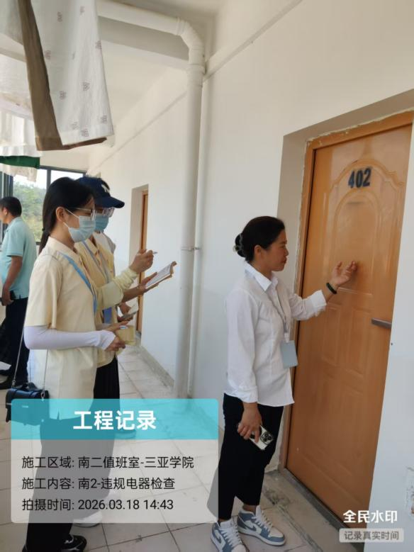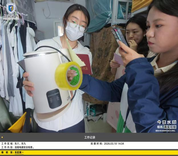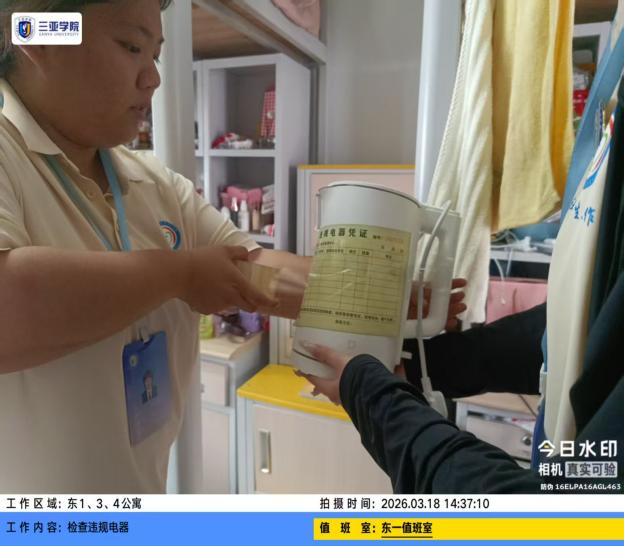 为深入推进“一站式”学生社区建设,切实筑牢校园安全防线,保障学生生命财产安全,3月18日(周三)下午,大学生社区教育与管理中心组织开展本学期第一次全校宿舍违规电器专项检查行动。本次检查由各行政老师、分区生活老师及学生助理联合参与,实现全校宿舍全覆盖、无死角排查,以安全管理赋能社区育人阵地建设。